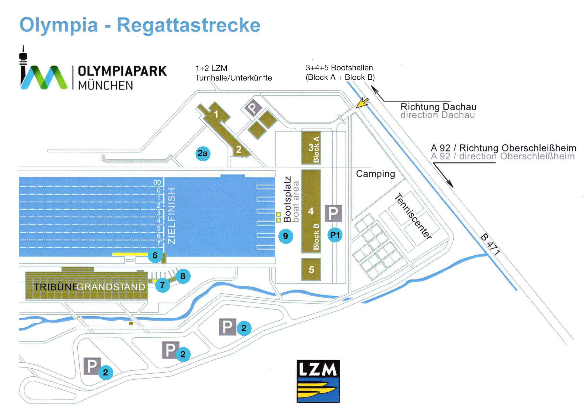 Parken: hinter den Bootshäusern (3 – 4 – 5) ist der Abstellplatz für Bootsanhänger und Zugfahrzeuge. Alle anderen Fahrzeuge parken hinter der Tribüne.
